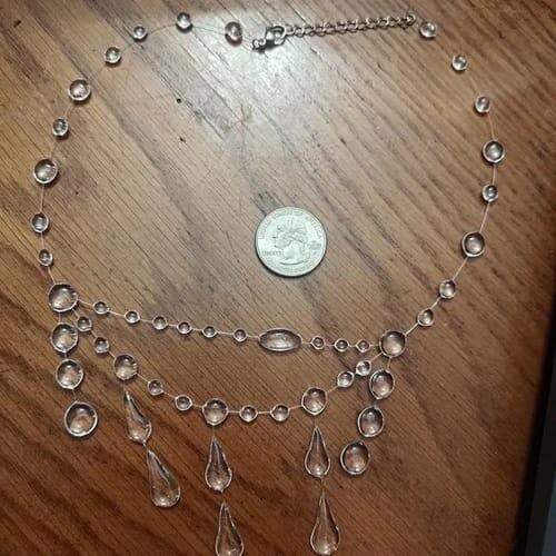 Each droplet is meticulously handcrafted to resemble water in its purest form, strung along near-invisible filament that seems to disappear against the skin. The upper layer gently hugs the neckline, while the lower tier drips with elongated teardrops, forming a soft, sculptural curtain of light.